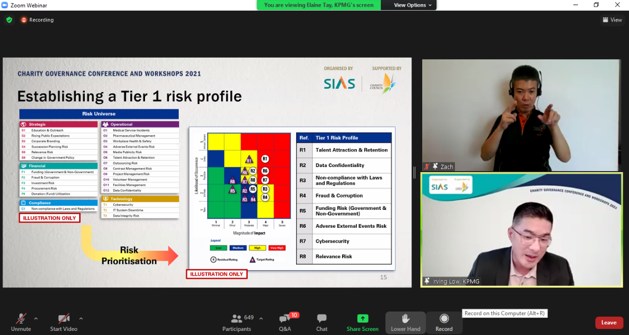 “Digitalisation: From Risk Management to Risk Resilience” was presented by Mr. Irving Low, Co-Head of Risk Consulting, KPMG. Mr Low shared on the changing risk landscape caused by the pandemic and the new risks which emerged that charities should be aware of. They are Cybersecurity/ IT Systems Risks, Relevance/ Strategic Direction Risk and Fundraising Risks. He also shared about risk governance which encompasses an organisation’s efforts to direct, manage, and report risk management activities across the enterprise based on the “Four Lines of Defense” principles. He encouraged Boards to set the right tone for the charities regarding risk management.